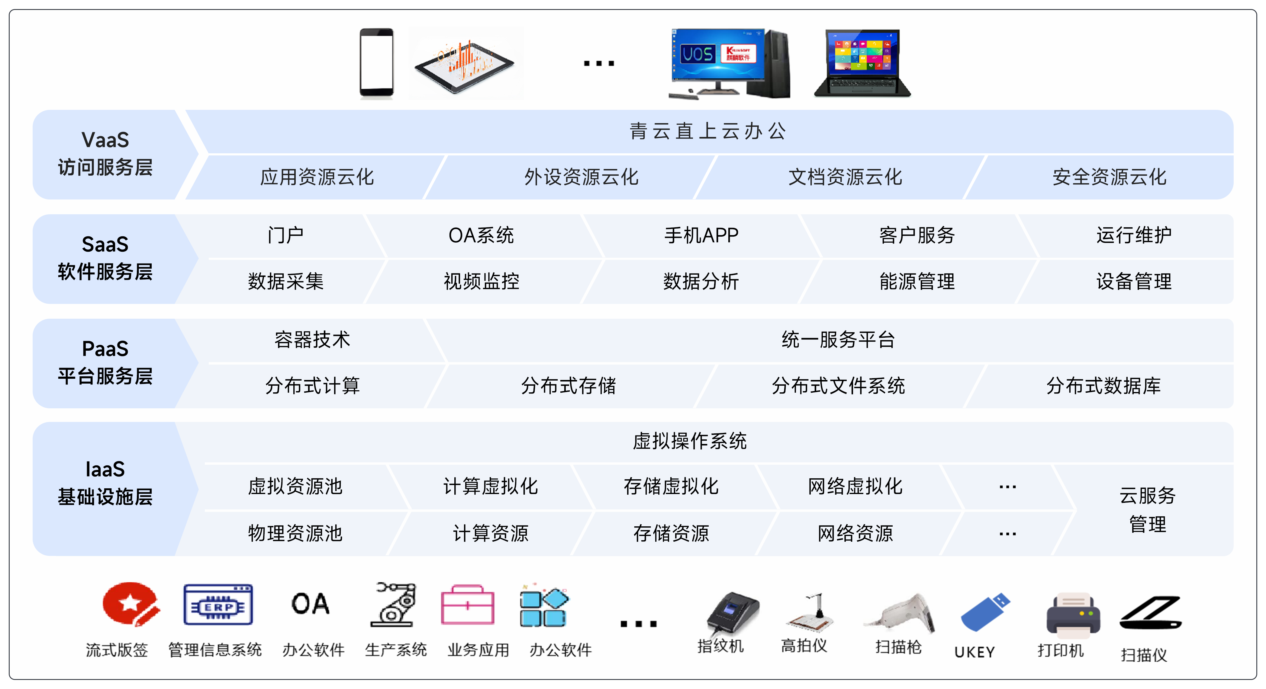 在现有 IT 基础设施和业务架构基础上,增加面向用户的“访问即服务”的VaaS层。VaaS层通过“微隔离和轻容器”技术,将组织单位业务上共性的、标准的各类 B/S 或 C/S应用、各种外设、文档以及访问安全快速云化,实现“访问即服务”。